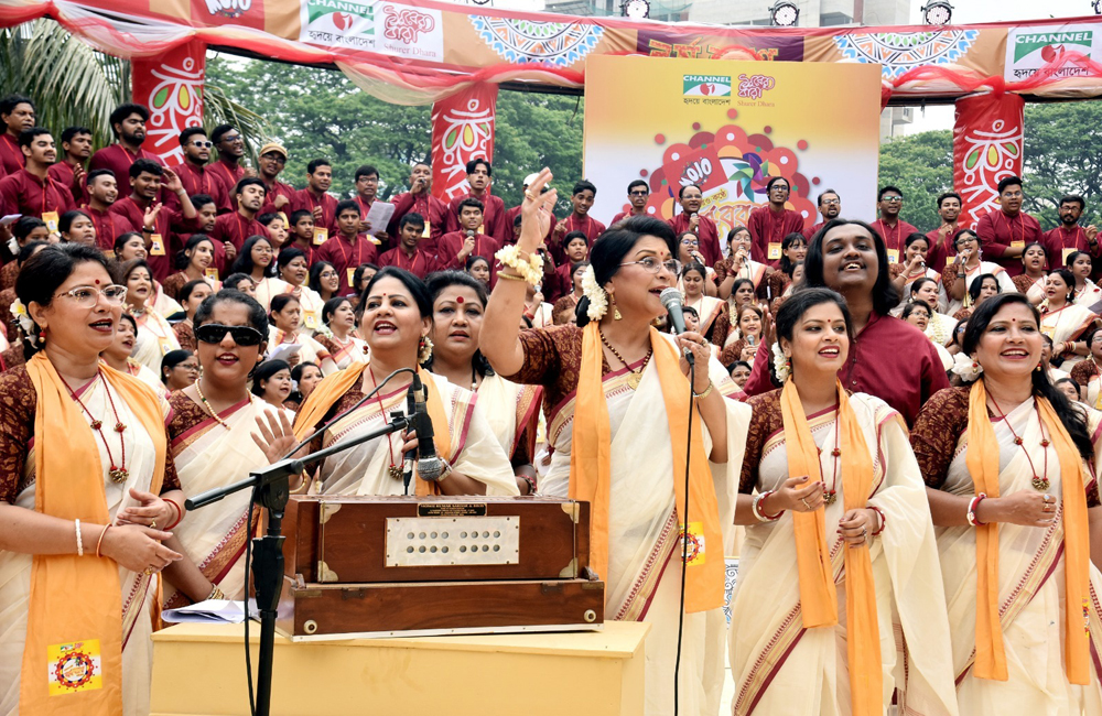 ধানমন্ডির রবীন্দ্র সরোবরে এবারও আয়োজিত হলো হাজার কণ্ঠে বর্ষবরণ। চ্যানেল আই এবং সুরের ধারার এই আয়োজনে এবার নেতৃত্ব দিলেন খ্যাতিমান রবীন্দ্রসংগীত শিল্পী রেজওয়ানা চৌধুরী বন্যা। ধানমন্ডির লেকের পানিতে তখনো সূর্য উঁকি দেয় নি। তার আগেই কানায় কানায় ভরে গেছে পুরো সরোবর। ভোরের আলো ফুটতেই মানুষের উপস্থিতিই জানিয়ে দেয় বাঙালি কতটা সংগীতপ্রেমী। দেশের বিভিন্ন প্রান্ত থেকে আসা শিল্পীদের সাথে রেজওয়ানা চৌধুরী বন্যা এবং তার সংগঠন ‘সুরের ধারা’র এই আয়োজনে শুভেচ্ছা বক্তব্য দেন চ্যানেল আইয়ের পরিচালক জহির উদ্দিন মাহমুদ মামুন এবং ঢাকা দক্ষিণ সিটি কর্পোরেশনের প্রশাসক আবদুস সালাম। এরপর ভোরের আলো ফোটার সাথে সাথে রবীন্দ্র সরোবর সুরের দোলায় দুলতে থাকে। ‘ওঠো ওঠো ওঠোরে’... গানের মাধ্যমে শুরু হয় আনুষ্ঠানিকতা। এরপর একে একে সংগীত পরিবেশন করেন হাজারও শিল্পীর সাথে রেজওয়ানা চৌধুরী বন্যা। রফিকুল আলম, ফাহিম হোসেন চৌধুরী, কিরণ চন্দ্র রায়, স্বাতী সরকার। শিল্পী কোনাল পরিবেশন করেন বাউল শাহ আবদুল করিম-এর গান। চমৎকার আবৃত্তি করেন জয়ন্ত চট্টোপাধ্যায়। অনুষ্ঠানের সমাপ্তি টানা হয় ‘এসো হে বৈশাখ গানের মাধ্যমে বৈশাখ’কে স্বাগত জানিয়ে।